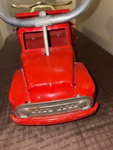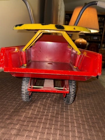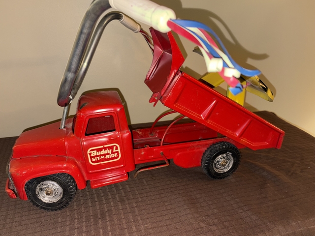 For Sale: Vintage Late 1950's - Early 1960's Buddy L Sit-N-Ride Dump Truck Pressed Steel Toy w/ Handle Bars. In really nice condition. (See photos) Surfaces have some scuffs, scratches and some paint loss. The handle bars, and the seat are intact. The decals on the cab doors have some chipping. A nice pressed steel Buddy L Sit N Ride dump truck. Overall displays well. Measures about 20 1/2” Long x 8 1/2” Wide (17 3/4” tall with the handle bars). Asking $130.00 cash or best offer. Message through here for additional details.