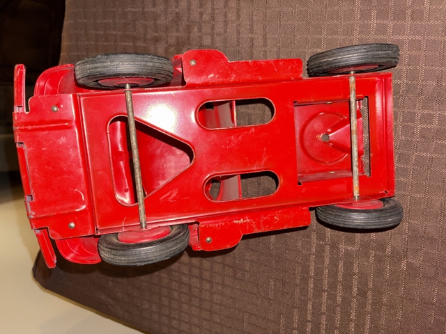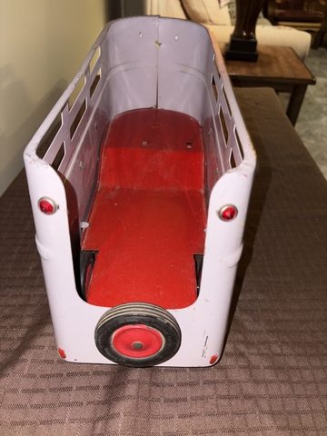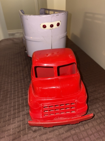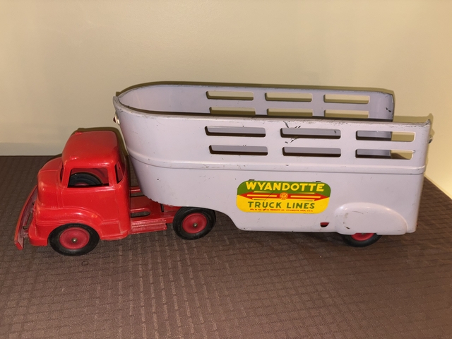 For Sale: Vintage Late 1950's Wyandotte Truck Lines Semi Tractor Trailer Livestock Hauler. COE design. The body of the truck cab is plastic, as are the wheels. The trailer and truck frame etc. are steel. Roughly measures 24” long, 6” wide, and 8” tall. In really nice condition! (See photos) Surfaces have some scuffs, scratches and some paint loss. Very complete! Overall displays well. Asking $160.00 cash or best offer. Message through here for additional details.