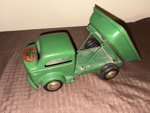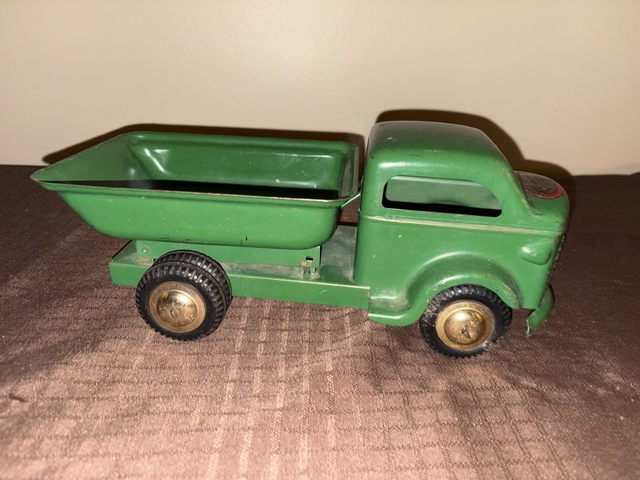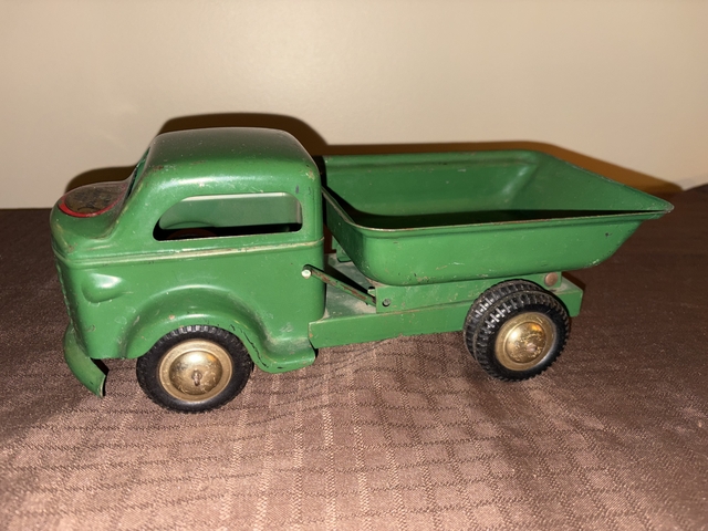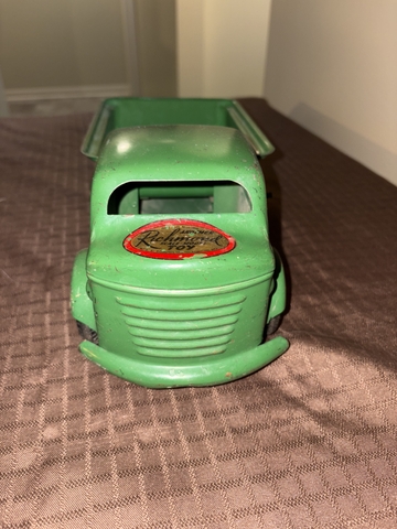 For Sale: Vintage Richmond Toy pressed-metal dump truck from the 1940s. The toy truck is made of pressed steel and has its original green paint.