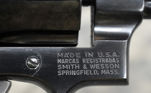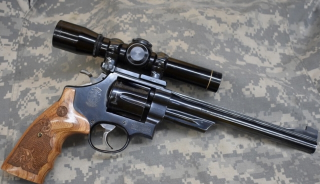 This is a Smith & Wesson Model 27-2 in .357 Magnum. This N-frame revolver was made 1977-78 and is in good condition. It features a blued finish, an 8 3/8” pinned barrel, 6-shot recessed cylinder, target hammer & trigger, nice wood S&W grips, and has a Leupold M8 2X ER scope mounted on a Leupold base as shown. It has normal wear from use, and edge wear of the bluing as shown. It has a good bore, crisp trigger, strong springs, good timing, and no signs of damage or abuse. A nice long-barrel 357 revolver for silhouette competition or handgun hunting!