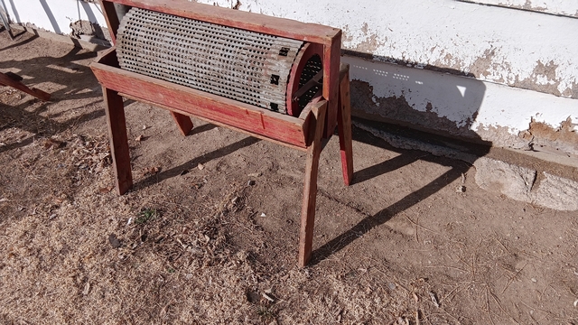 The rotating perforated drum had seeds pass through it. Seeds then passed through to fall into a container. Larger seeds are retained or directed elsewhere.