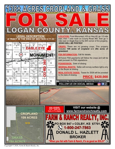 Located in Logan County, Kansas, this 138± acre tract offers a strong combination of productive cropland and grassland with excellent access and quality soils. The property consists of approximately 109 acres of cropland and 29± acres of grassland, providing both income potential and grazing opportunity. The cropland features predominantly Keith silt loam soils with 0-1% slopes, offering highly desirable farming conditions and efficient field layout. There are currently no growing crops, allowing the Buyer full possession at closing and flexibility for the upcoming crop year. FSA information is available upon request, and all future FSA payments will follow the crops pursuant to FSA regulations. Seller will convey surface rights only. Real estate taxes for 2026 will be prorated to the date of closing. This property presents an excellent opportunity for producers looking to expand their operation or investors seeking quality northwest Kansas farmland with strong soil characteristics and immediate usability.