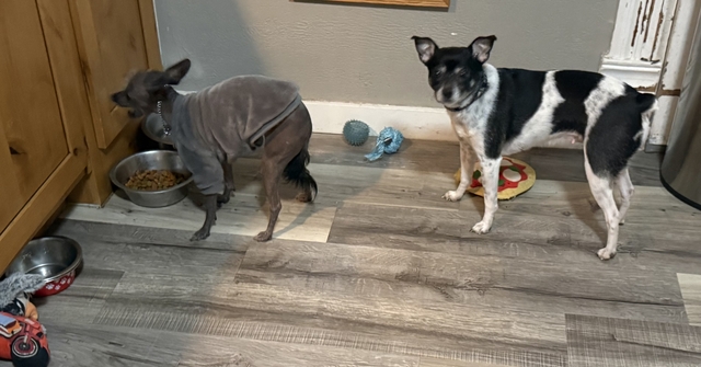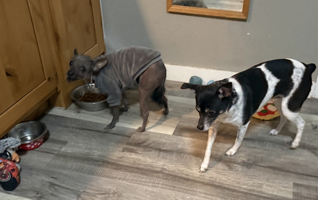 2.5 year old rat terrier and 2.5 year old Mexican Hairless female to rehome. We are moving and can not keep them. $50 rehoming fee. Would do best in a home without cats or large dogs. Would like them to go together but understand that may not work. Text 785-365-0826 with questions.