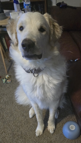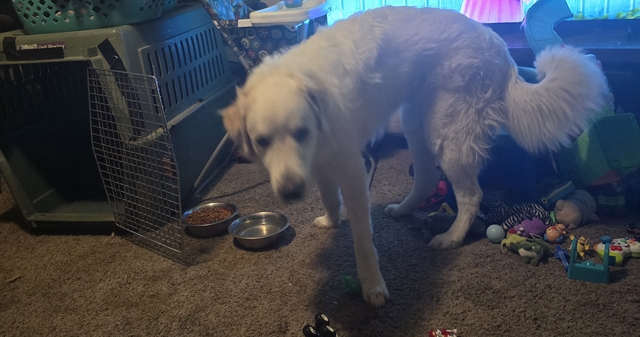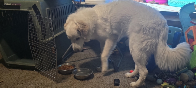 I have an 8 month old Great Pyrenees male. He's a good dog. Crate trained. Potty trained. Knows some basic commands like sit. The only behavior problem he has is food aggression. Its only to treats or foods he's not supposed to have that he got into. For example my son dropped a wrapped rice crispy treat, the dog grabbed it and when I tried to get it from him he growled and tried to bite me. We have tried to work through the food aggression but haven't had much luck. Unfortunately he's tried to bite my kid so we need to rehome him. He's fully vaccinated. I have paper records. He can come with a bed, 2 big crates(one is cracked in the front but still holds him well), brushes, poop bags, and other misc supplies. So far he's done ok with being around other dogs. We only have him so it's durring outings. He's ok around cats. He does like to try to play with them. One of my cats plays with him all the time. The other just runs away when approached by the dog. I wouldn't trust him around chickens yet. He needs to be further trained to not chase them.