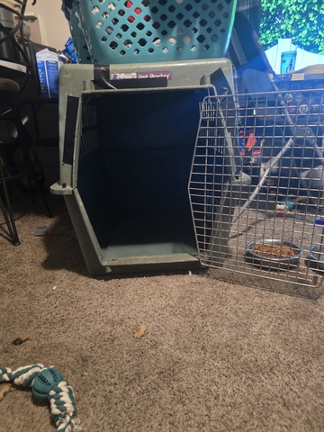 He really is a great and loving dog and we are sad to see him go. You will need a big vehicle to get him and all his supplies. The crates are very large and one does not break down.