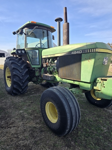4840 John Deere Tractor, powershift, 3 hydraulics, 2 rear tires are in great (like new) condition, starts right up, needs a cab kit and some TLC, AC motor blows but not cold air, 10 weights in front, comes with duals but they're older condition, hours are unknown. $27,500 OBO.