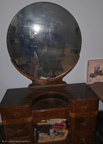 Beautiful original Art Deco waterfall bedroom set featuring matching dresser and vanity with large round mirror.