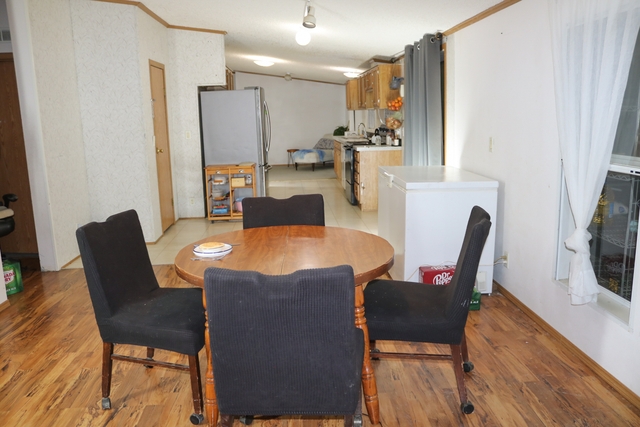The kitchen features a functional bar counter, ample cabinetry, and a pantry for additional storage — perfect for everyday living. An open concept dining room with track lighting creates a warm and inviting space for meals and family connection. Adjacent to the dinning room is a convenient utility/mud room and a quarter bath for guests. This layout offers both flow and functionality.