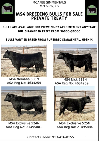 I have 18 Purebred Simmental, % Simmental, and purebred angus yearling bulls for sale in northeast Kansas. Contact Caden at (913) 416-0155 for more information or to set up a time to take a look at them.