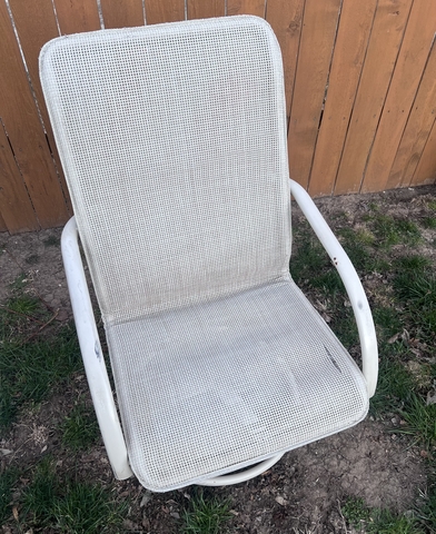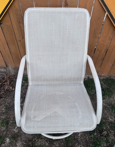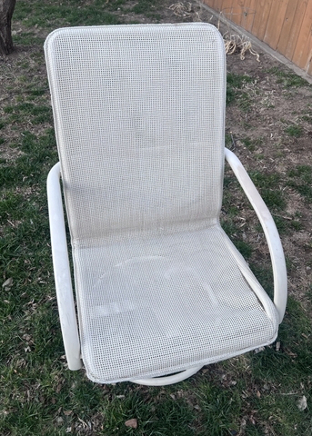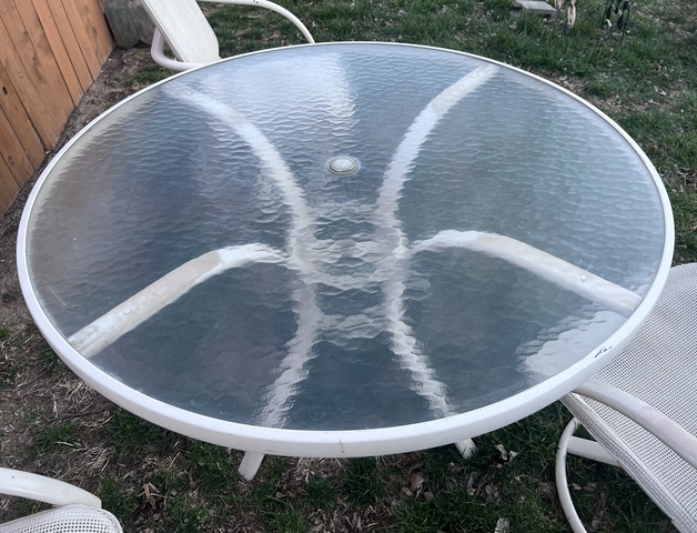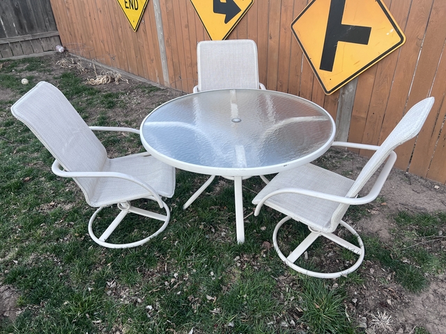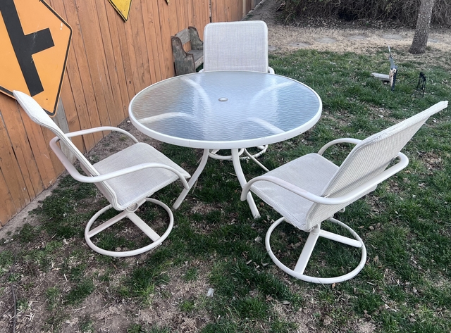 Have an Outdoor Patio Table with Glass Top & 3 Swivel Rocker Chairs. Table frame and chairs are a light beige/off-white in color. Table measures 48” in diameter and is in used but good condition. Chairs are used condition and all 3 have a small tear in heavy duty fabric seating area by frame. All chairs are functional, and you could always put another chair pad cushion in seating area if you wanted. (NO HOLDS)(No Deliveries)(CASH ONLY) LOCATED IN HAYS, KS