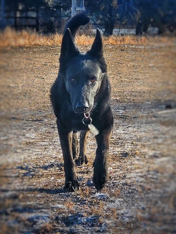 This is Autumn. She was born in June of 2013, she is 11 years old. She is still a puppy though, do not be deceived by her age.. very energetic! Her favorite activity is chasing bird shadows.. Loves shadows/lights.. She's like a cat in that way. Running/fetching is her sport so she requires a safe yard. She is very protective of her family and home and will let intruders know, not recommended around children or small animals unsupervised. Raised a pack dog so she gets along great with other dogs her size. She does very well on her own though. She thrives outside, but sleeps indoors at night in her kennel. Incredibly fast learner and knows all basic commands.