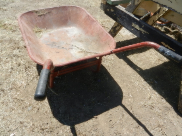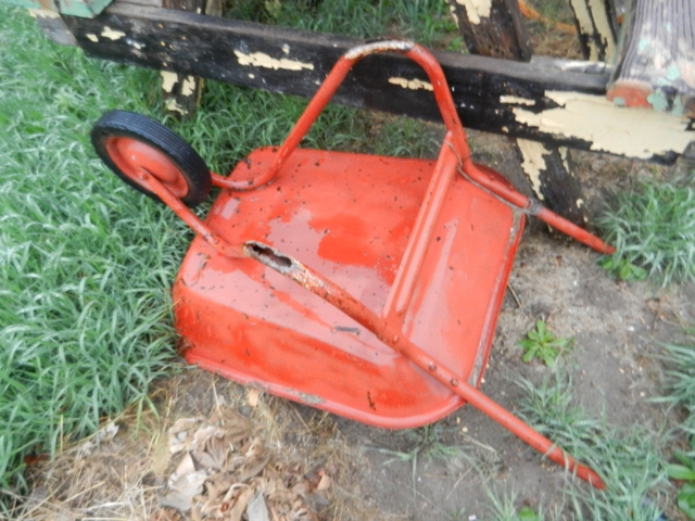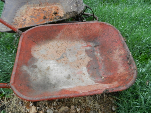Nice display piece for flowers, in a garden or as a yard decoration. It does show its used condition with a rusted handle which is still attached, rust spots on the legs, discolor of top area but no holes. The rubber wheel does roll. Arrangements for payment and daytime pick up will be made at the time of sale. CASH ONLY: $25.00. Located at Plainville.