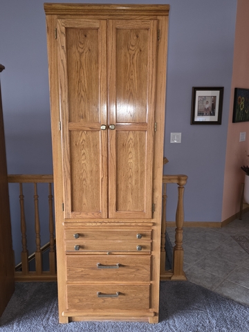 Excellent condition! Commonly used in bedrooms or bathrooms. It features a tall, narrow design with double doors on top and several drawers below, providing a combination of concealed shelf storage and drawer organization. Has shelf that pulls out for night stand.