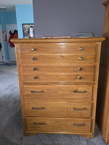 This piece is a vintage tallboy chest of drawers, often referred to as a "highboy" dresser, typically crafted from oak with a visible tiger oak or honey oak grain finish.