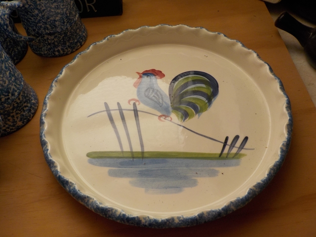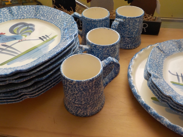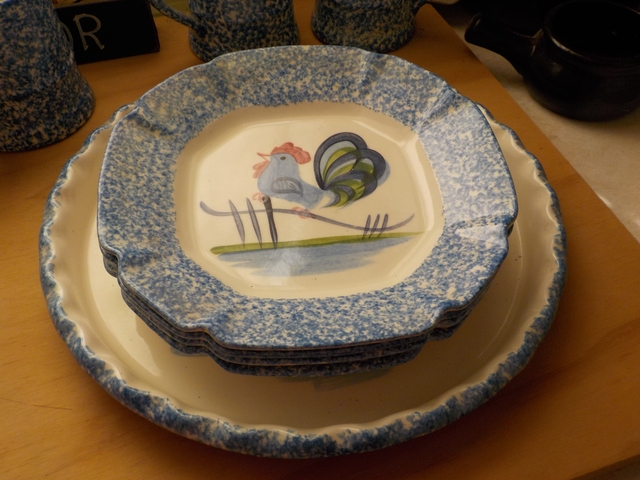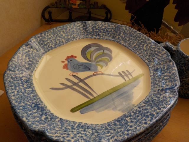 The Rooster Chicken Dinner Set brings a touch of countryside charm to any dining experience. The dinner set features 8 dinner plates, 4 salad plates, 4 beverage cups and 1 serving dish. Each plate with a delightful rooster in the center is surrounded by a blue speckled rim. The dinnerware is in great used condition without chips, cracks, dark marks, or staining. The stoneware and ceramic construction ensure durability while the shiny finish complements any decor. CASH ONLY - $40.00. Arrangements for daytime pick-up will be made at the time of the sale. The set is located at Plainville.