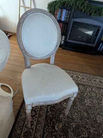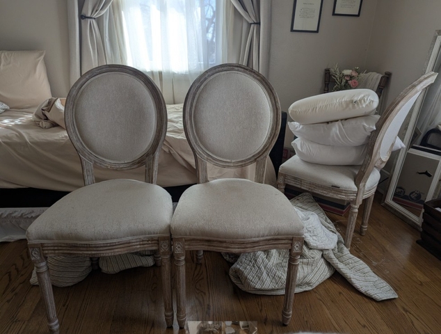 There are 6 chairs total. One has a small stain on the seat. The rest are in perfect condition. You may purchase all 6 for $150 or $30 for an individual.