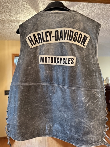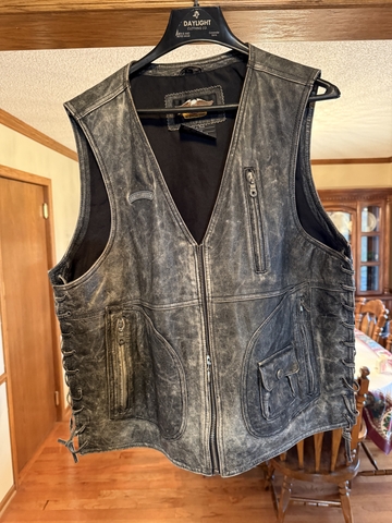 For sales Gunine Harley Davidson Mens Vest. Stressed leather look. Like new condition. Tag says size large but I wear extra large and fits perfit. Size can be adjusted on strings on the side.