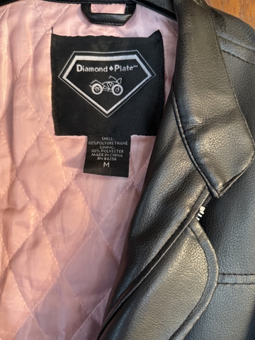 For sale is a Ladies Size Medium Motorcyle Jacket. Brand is Diamond Plate. Shell is 100% Polyretethane and 100% Ployester lining. Made in China. Great condition and priced to sell at $10.00. Comes form a non smoking home.