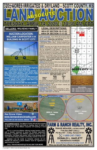 This property will be offered at Absolute Public Auction on Tuesday, April 14, 2026, at 10:30 a.m. CDT at the William Carpenter 4-H Building in Scott City. Bidding will be available in person, online, or by phone, with prior registration and approval required for online and phone bidders. Terms include 10% down the day of sale, with the balance due on or before May 21, 2026. Taxes for 2026 will be paid by the Buyer.