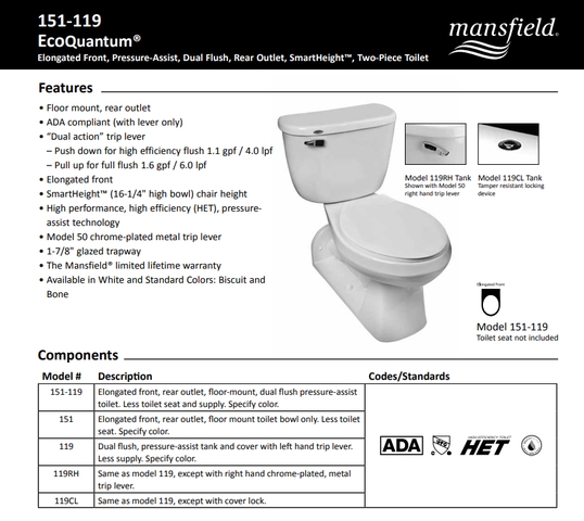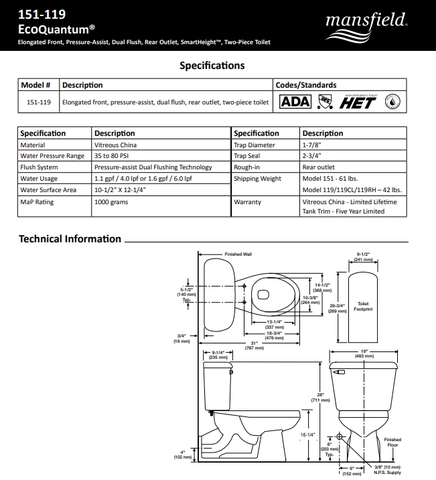Mansfield elongated, pressure assisted, dual flush, rear outlet, two piece toilet