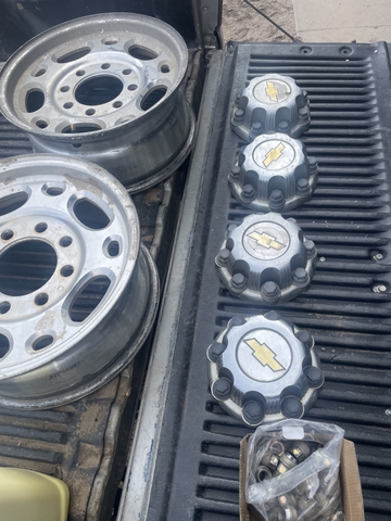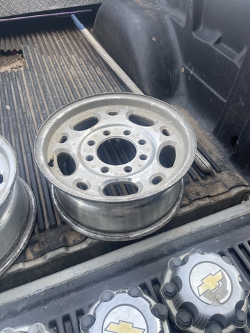 I have 4- 16" x 6.5" -8 bolt Chevrolet aluminum wheels I took off my pickup I've owned since it was new. Included are 4 used tires, bolt covers and lug nuts. Not bent but they have wear.. 200,000 miles on them. I put new wheels and tires on my truck is why I'm selling them.. Package deal Cash only and first comes with money gets them.. 200.00 for it all.. I'm not splitting it up.. Either you buy or not..