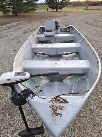 14ft LoweLine aluminum boat (believe 1974) back when boats were made with thicker aluminum. Solid, in good condition. 61" at widest point, 23" at deepest point. Pivoting cushion seat, bench seats.