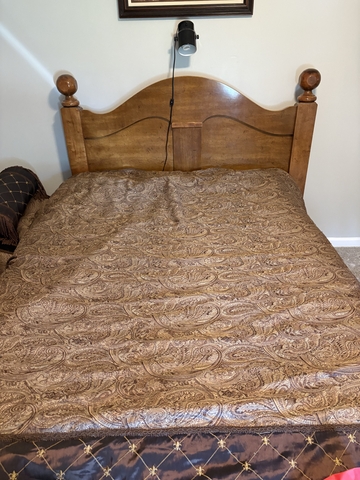 Queen size decorative wooden headboard in perfect condition. If you can move the clean, comfortable mattress and box springs they are free.