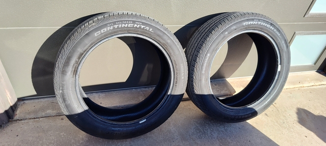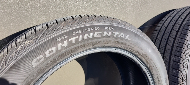 Two 245/50/R20 used Continental Cross Contact LX Sport used tires for sale. Both tires have an even wear pattern and were removed from the rear wheels of a front wheel drive vehicle. Both tires have plenty of tread life with an even tread depth of approximately 0.28" remaining. Both tires for sale as a set for $50