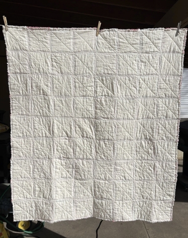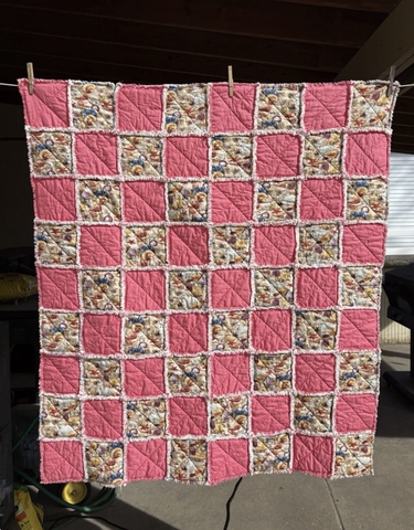 Handmade rag quilt. It has been washed and dried twice to start the ragging process. The more it is washed and dried, the 'snugglier' it becomes. It measures 42" x 52". It is 100% cotton.