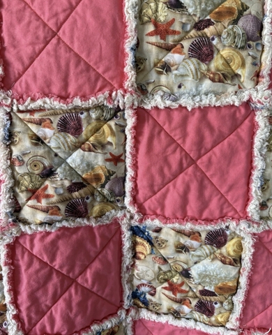 This rag quilt has a beachy feel with the seashell material 🐚🐚🐚