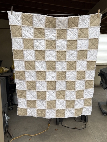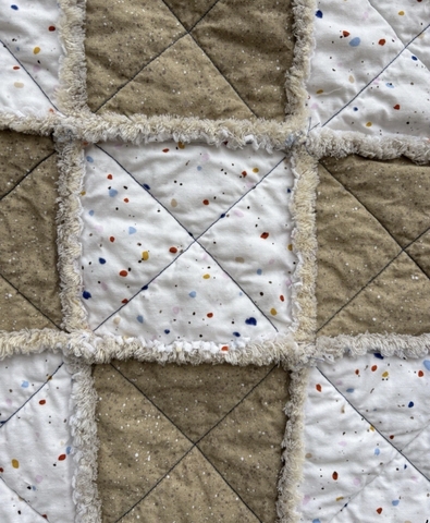 Handmade rag quilt. It has been washed and dried twice to start the ragging process. The more it is washed and dried, the 'snugglier' it becomes. It measures 42" x 52".