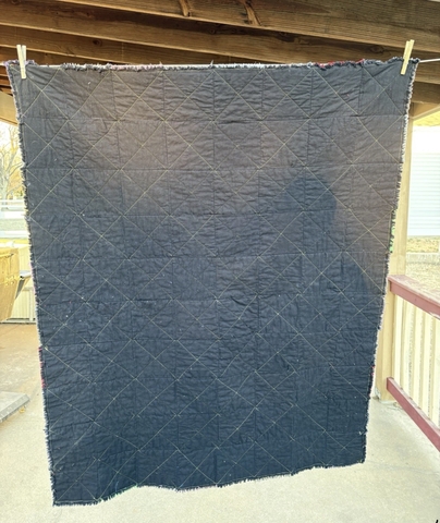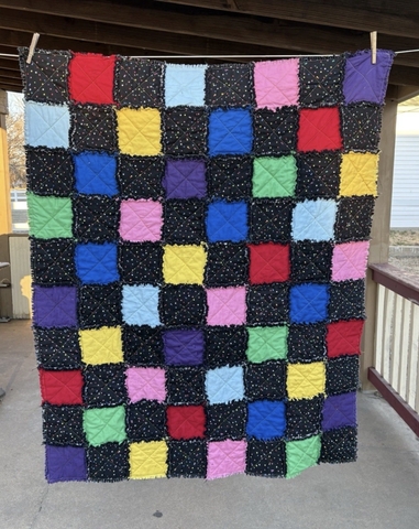 Handmade rag quilt. It has been washed and dried twice to start the ragging process. The more it is washed and dried, the 'snugglier' it becomes. It measures 42" x 52".