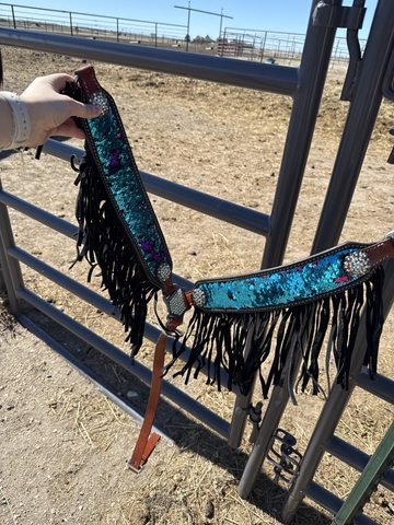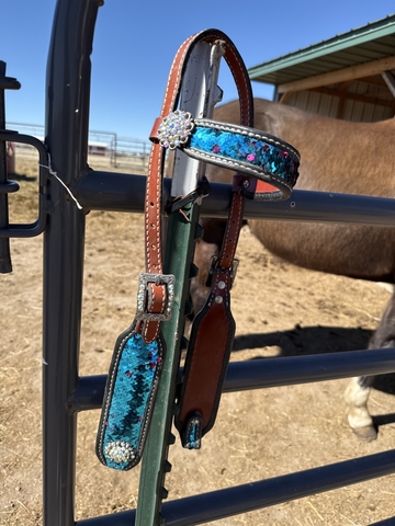 This tack set is new never used didn't fit our horses small face correctly. But it's flashy and beautiful. It's flip sequin or it's either blue or pink; whichever you like. We paid $175