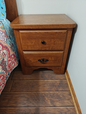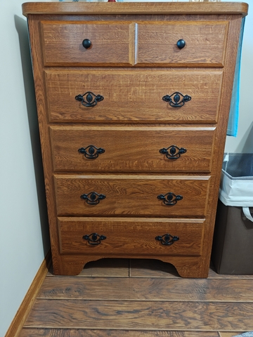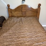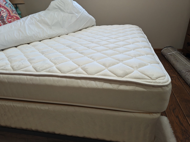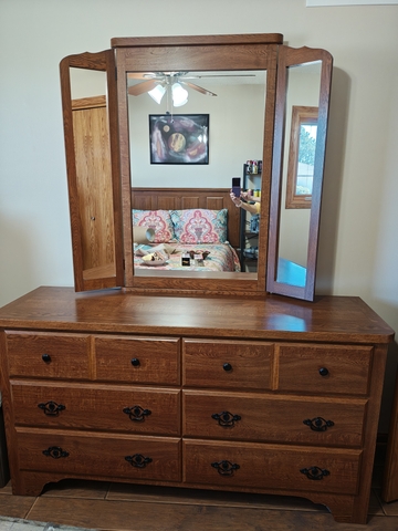 Headboard, nightstand, tall dresser, dresser with a mirror, and full size mattress and box spring. This set was in a spare bedroom and rarely used and the mattress is in great shape. The headboard can also be used for a full or queen size mattress. Pet and smoke free home