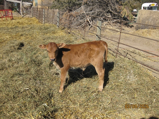 Jersey 1st calf heifer with her bull calf, she was AI bred to an A2A2 Jersey bull, She has a nice even bag and long handles for a first calf heifer if someone wanted to hand milk. I have not milked her, letting her calf get a good start, calf born 3/3/26. Call or text or message here, 785-743-8065
