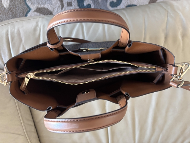 • Interior details: back slip pocket, center zip compartment