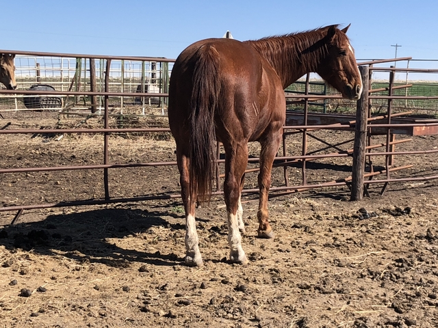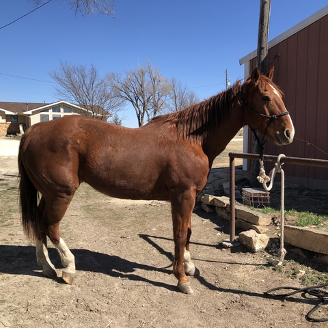 "Red" is a 6 yr.old quarter horse gelding pushing 16 hands high. This big guy came from Oklahoma and was told he was used in the stock yards loading cattle. Now he is used primarly on trail rides. He is a gentle boy that gets along with others on the trail as well as in the lot. He does not buck, bite and has no issues on nature trails as well as simple home-made obstacle course. side passing and ground working skills. Its my belief he has alot of potential and will try to please you with a gentle hand. I feel this 6 yr. old needs more work than this 70 yr old can give him. He deserves a Good caring home. I dont feel he is a kids horse at this point. I will be honest and answer any questions you may have. Tx or call 785-545-5310