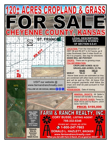 LOCATION: From the intersection of Hwy 36 and RS 877 in St Francis, go 7 miles Southwest, then 2 miles South on Rd 7, West on Rd H 1 ½ miles, South 1 mile on Rd6.5, South on Rd 5, ¼ mile. See map for directions. SIGNS WILL BE POSTED!!