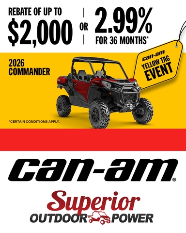 A true hybrid between work and play, the 2026 Can-Am Commander XT 1000R has a $2,000 rebate during the Can-Am Yellow-Tag Event, going on now through April 30th! One Fiery Red model in stock and one Triple Black in stock, ready to roll out the door for $19,999 after rebate, PLUS a 2-year ag warranty!
