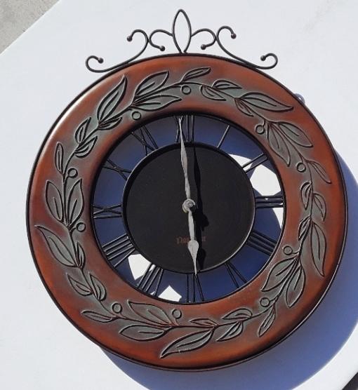 13” Wall Clock – $8.00 Selling a very nice 13” decorative wall clock. The clock face is 8’. Battery operated with 1-AA battery. Like new condition. The overall color of the clock is a bronze/brown color with the tint of patina around the raised decorative leaves.