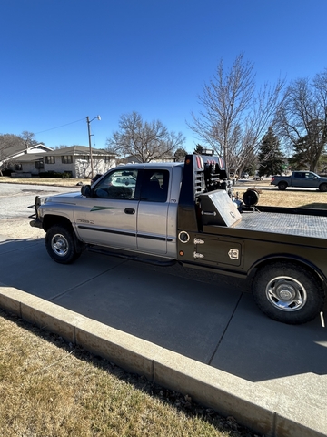For sale: 1999 Dodge 2500 4 door extended cab 4x4. Automatic transmission (JUST REBUILT WITH PAPERS). 5.9 liter V8 Magnum gas engine. RanchHand full bumper replacement. ONLY 129,300 miles!! Service flatbed with 4 toolboxes. Interior in excellent condition...exterior is very good. Heat A/C tilt cruise all work. Less than 1200 miles on new 235/85/16 tires. Fresh service just done. Typical Gen II steering 🥴..Clean title. $12,500 OBO. Montezuma toolbox and electric start PUMA air compressor included for $1000 more. Call or text 785 871 8160 for more information. Thanks.