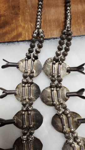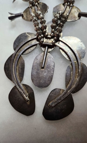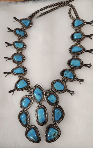 Here we have a Vintage Navajo squash blossom necklace featuring turquoise stones set in sterling silver, dating from the 1960s to the 1970s.