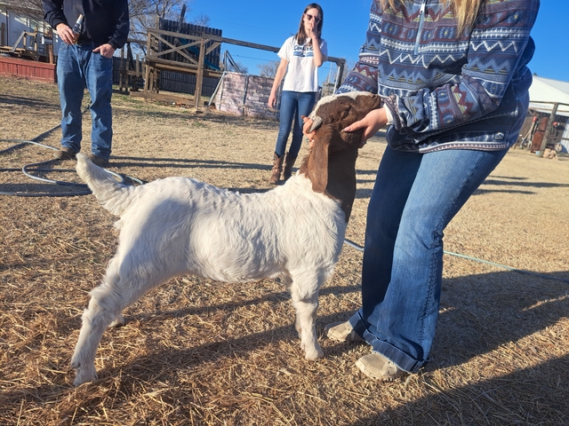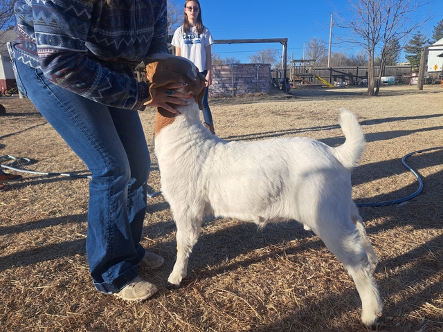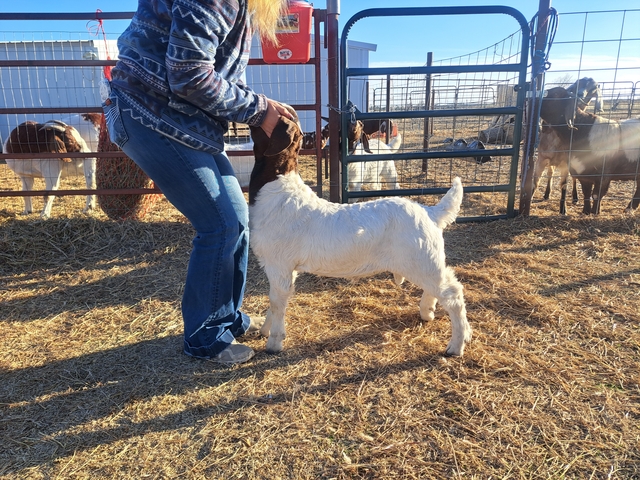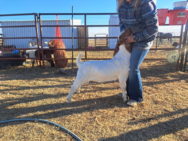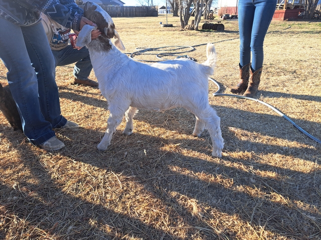 Frederick - last weight was 62 lbs with a rate of gain at .62 lbs/day. He's big, built right and would make a great buck prospect or he can be wethered and hit a bunch of jackpots and catch some eyes! 100% abga.