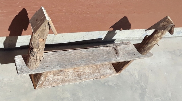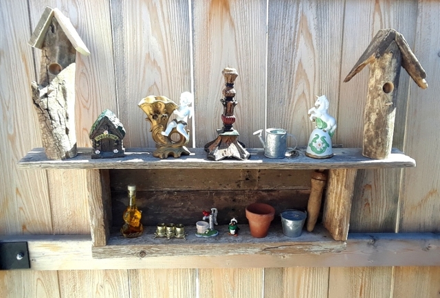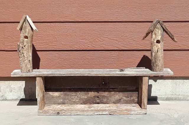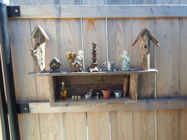 Fence Art Decor - $20.00 Selling a unique Yard Art Décor that can be mounted on your fence to display your favorite outdoor knick knack items. 2 shelves and 2 birdhouse themed top mounted pieces. This is designed to mount on your fence, post or garden wall to display various outdoor knick knack items including old bottles, rusted antique pieces, collectible trinkets, curio items, ceramic or glass décor and seasonal pieces. Dimensions” 36” wide, 22” tall, 4½” deep with two 4” deep shelves that are 22” wide to place your knick knack items on. Made for outdoor display in the style of the old weathered barn wood. The attached sample photo shows an example of various items that could be screwed and glued on the top and bottom shelves. (the various knickknack items shown in the sample photos are NOT included) That is fun part. Decorating your shelves how you want them to look!