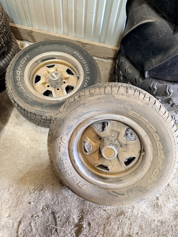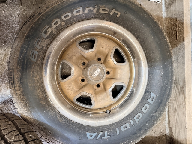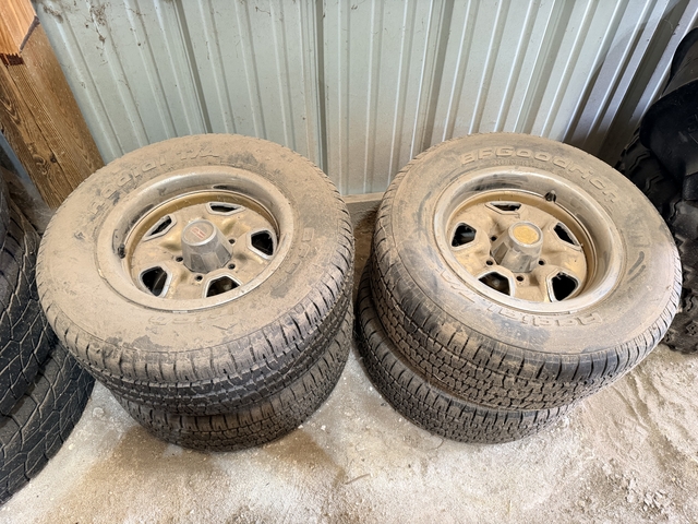 4 14" Oldsmobile mag wheels and bfg tires. 245 65 14. Tires were new but have set for a while all 4 center caps. I call theses rocket wheels. Good condition have been setting in shed for years. Let's make a deal