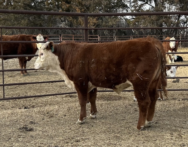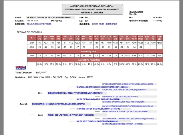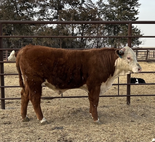 Yearling Horned Hereford Bull by son of Sensation 28x. Excellent maternal EPD's Top 5% of the breed for milk, mature cow weight, teat and udder. Weaned at 605lbs and has a yearling weight of 1055. Red necked. 100% pigment left eye, 70% right eye.