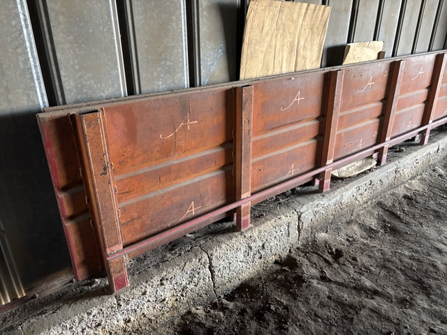 These were used on a 1962 Chevy 2Ton truck. The bed was made by Hillsboro. Not sure what the " A " painted on the sides means. Paint is original. All four sides are included and complete. The 7.25" wood toppers are also included. The long side measures 15ft 8.5in Long X 28.25in High. The front panel is 88.25" Wide X 28.25" High.