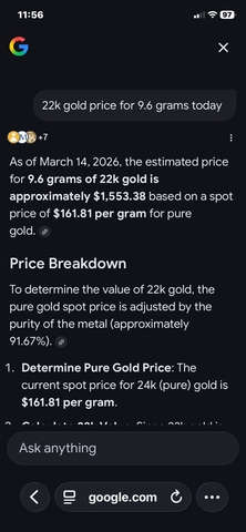Looking to sell weighs 9.6grams is 22k from what the pawn shops told me. Looking to sell to someone with more interest in this sort of stuff. 1500obo