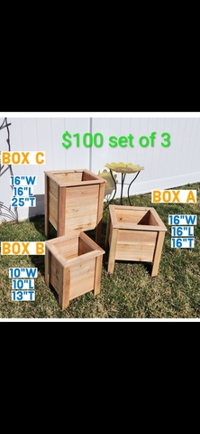 Handcrafted cedar planters built to last! Naturally rot-resistant and perfect for vegetables, flowers, or herbs. Great for patios, decks, or gardens. Prices and dimensions on photos. Located in Esbon. Can also make others if you have a certain kind you like we can make it happen. Please message me if interested. Will deliver within a reasonable distance for a delivery fee.