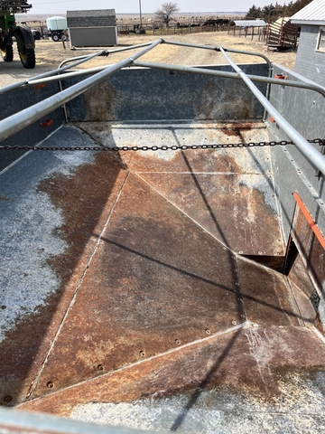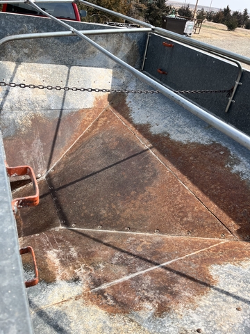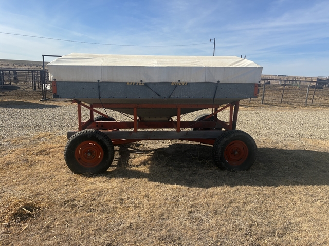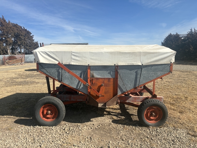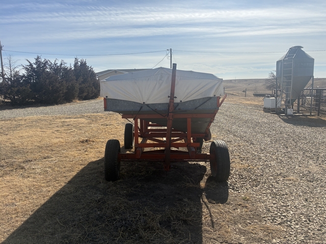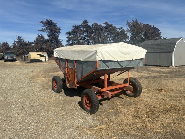 Holds 100 bushels of rolled corn. Has narrow spout to fill buckets. 2 new tires all tires hold air. Has tarp